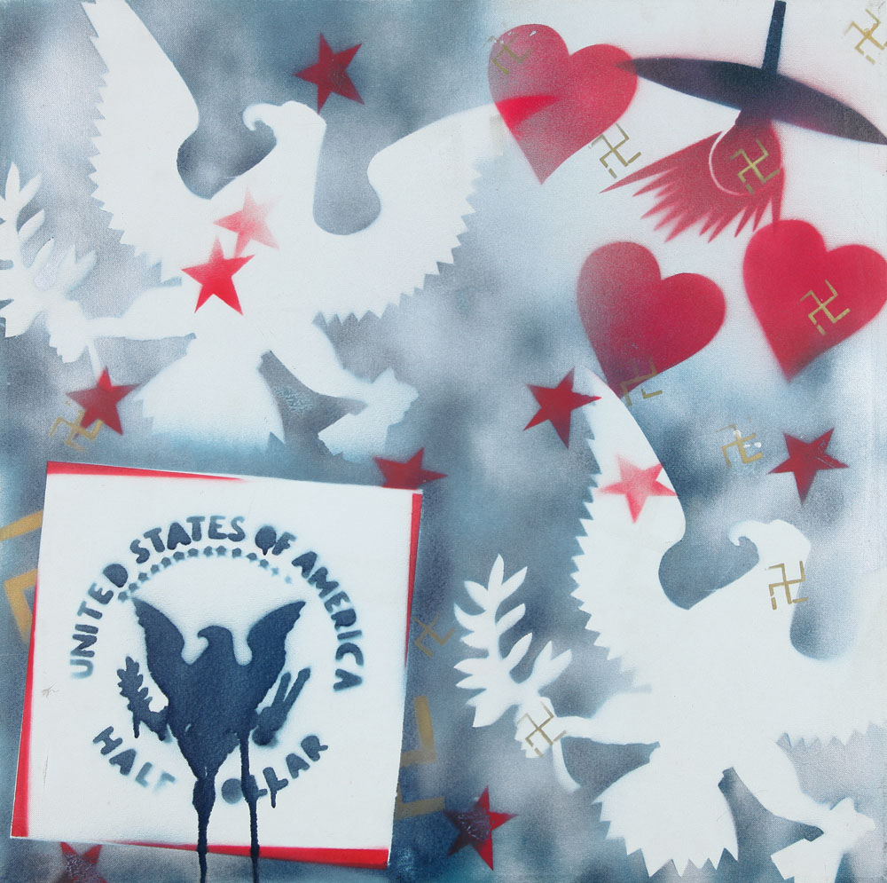 FRANCO ANGELI Roma 14/05/1935 - Roma 12/11/1988 Half Dollar, 1973 smalto spruzzato su tela cm. 85x85, firma al retro, opera registrata presso l'Archivio per la Monografia "Franco Angeli 10 Mercanti Un Artista" al numero C.P.153 come da dichiarazione su foto di Angiolino Calestani.