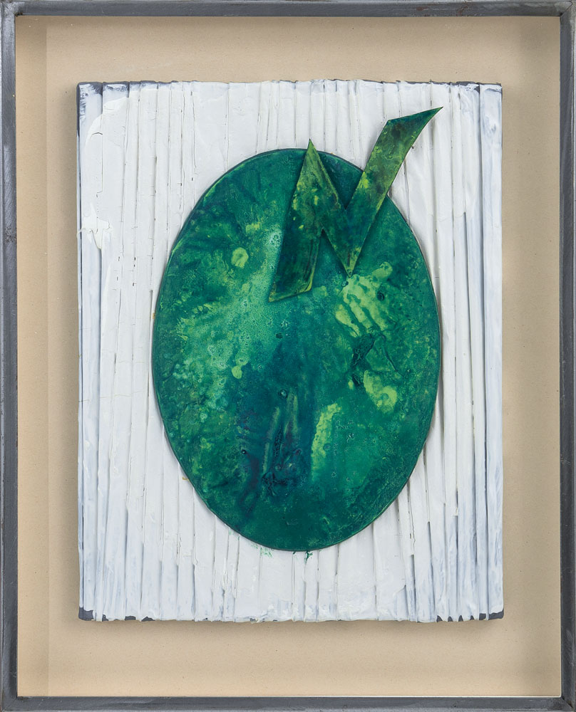 acrilici su lamina di piombo operata e applicata su tavola cm. 42,5x33,5; con cornice dell'artista cm. 56x45, firma e anno al retro, dichiarazione d'autenticità dell'artista su foto.