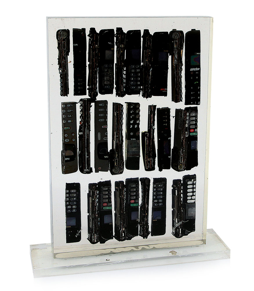 inclusione di frammenti di telefoni in resina epossidica cm. 51,5x42x12, esemplare 37/100, firma in basso a destra.