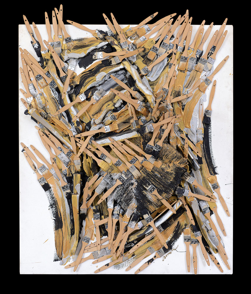sedia rotta e accumulazione di pennelli su tela con pittura acrilica gialla, argento e nera cm. 140x120x50, firma in basso a destra, opera registrata presso l'archivio Arman a cura della Galleria Dante Vecchiato come da dichiarazione su foto, opera priva di cornice.