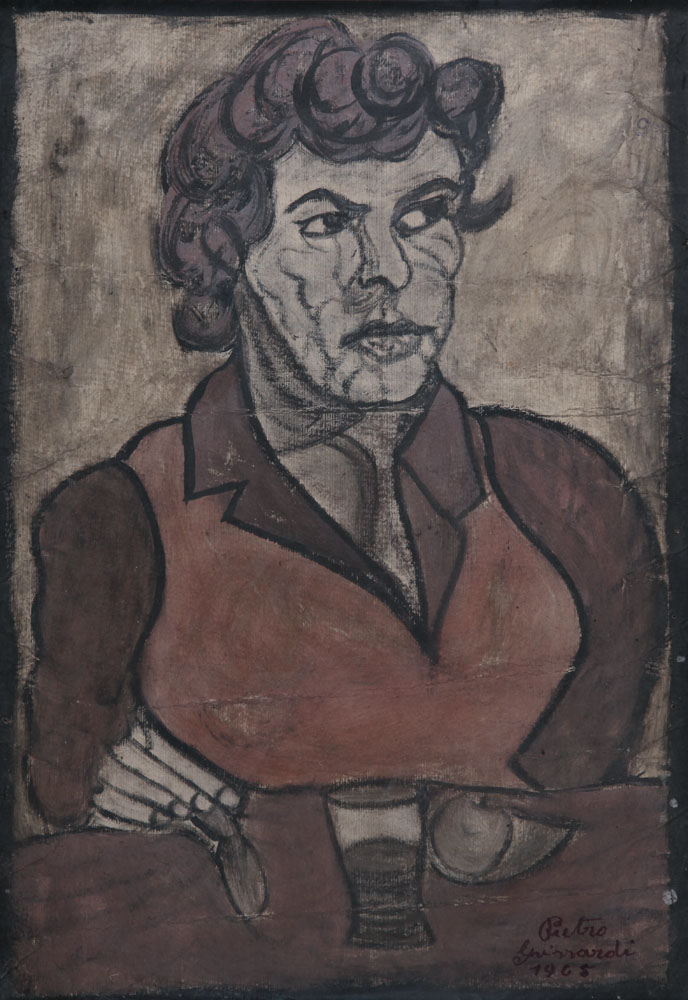 PIETRO GHIZZARDI Corte Pavesina (Mn) 20/07/1906 - Boretto (Re) 1986 Figura, 1965 olio su cartone cm. 80x53, firma e anno in basso a destra, firma e anno al retro.