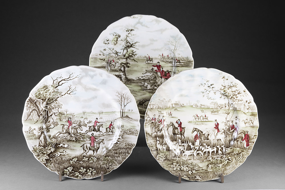 Manifattura di Johnson Bros gruppo di tre piatti in ceramica con bordo mistilineo decorati con scene di caccia alla volpe in policromia (diam cm 27) Manufacture of Johnson Bros. Group of three ceramic plates