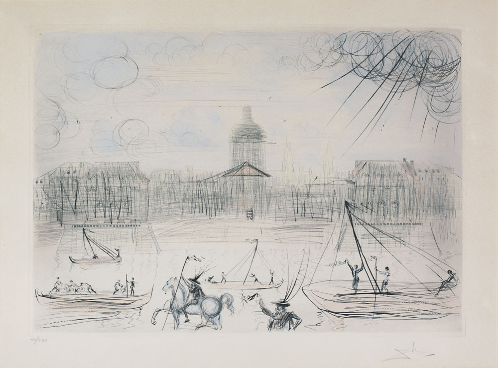 SALVADOR DALI’ Figueras (Spagna) 1904 - 1989 Institut de l'Academie Francaise, 1977 puntasecca acquerellata su carta cm. 57x77, esemplare 50/250, firma in basso a destra, certificato d'autenticità delle Edizioni d'Arte Antico Torchio Lithobottega (VA) allegato