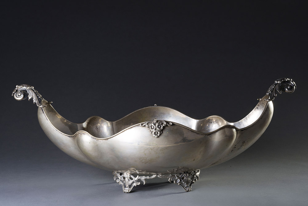 Centrotavola in argento di forma allungata e baccellata, anse a rocaille e...