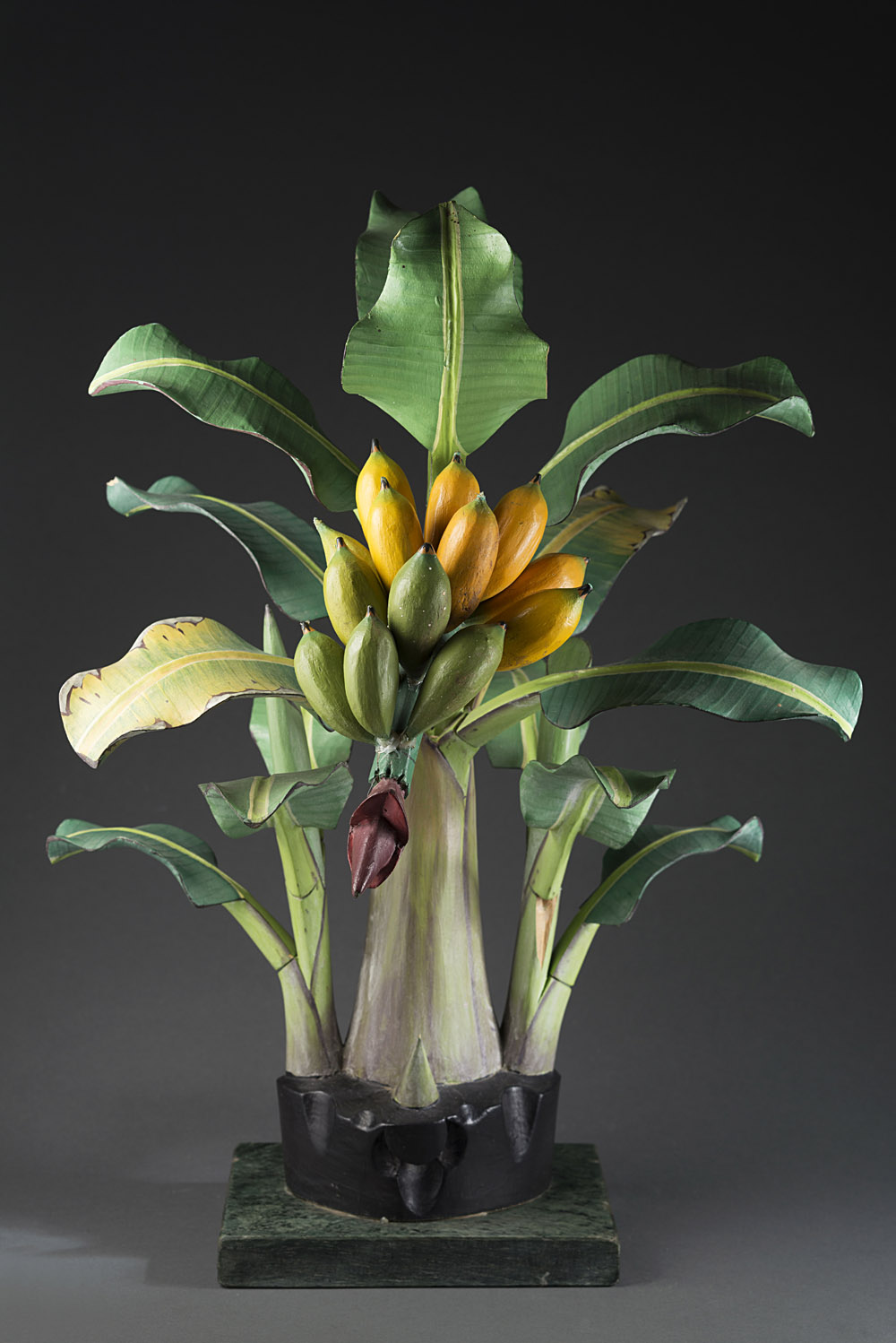 Manifattura orientale scultura in legno laccato e scolpito rafffigurante un albero di banane (h cm 54). Base in marmo (difetti, mancanze e restauri) Oriental manufacture. Sculpted and lacquered wooden sculpture. Marble base (defects,losses and restorations)