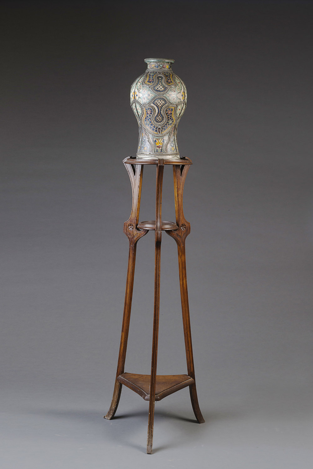 Lotto di un vaso di manifattura orientale decorato con ghiera in metallo ed un trespolo portavaso con intaglio 'liberty' (difetti) Lot comprising an oriental vase and a vase pedestal (defects)