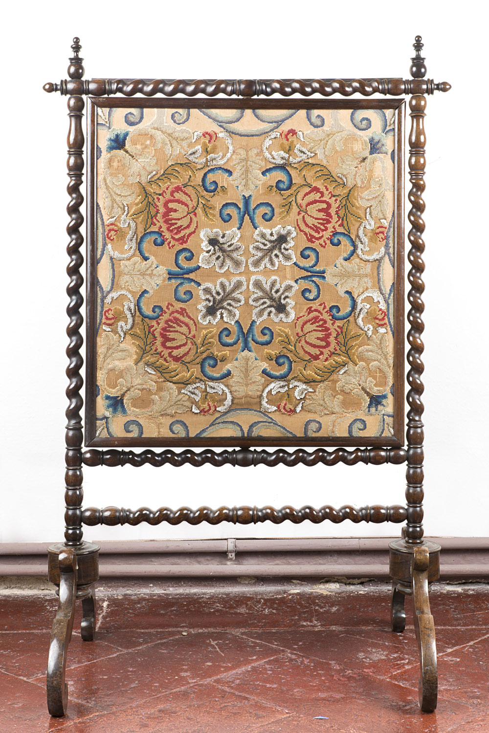 Parascintille con struttura in noce e montanti torniti. Cartella basculante ricamata a piccolo punto perlinature con motivi floreali e volute. Sec. XIX (cm 105x68)(difetti) Walnut wood fire-screen with tilting petit-point needlework screen. 19th century (defects)