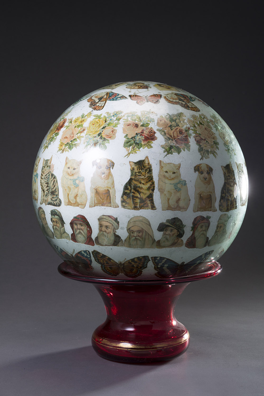 Elemento decorativo di forma sferica in vetro soffiato decorato a decoupage con farfalle, gatti, cani, volti e fiori su fondo bianco e poggiante su base in vetro decorata a dorature (h cm 26) Round blown glass decorative element on glass base