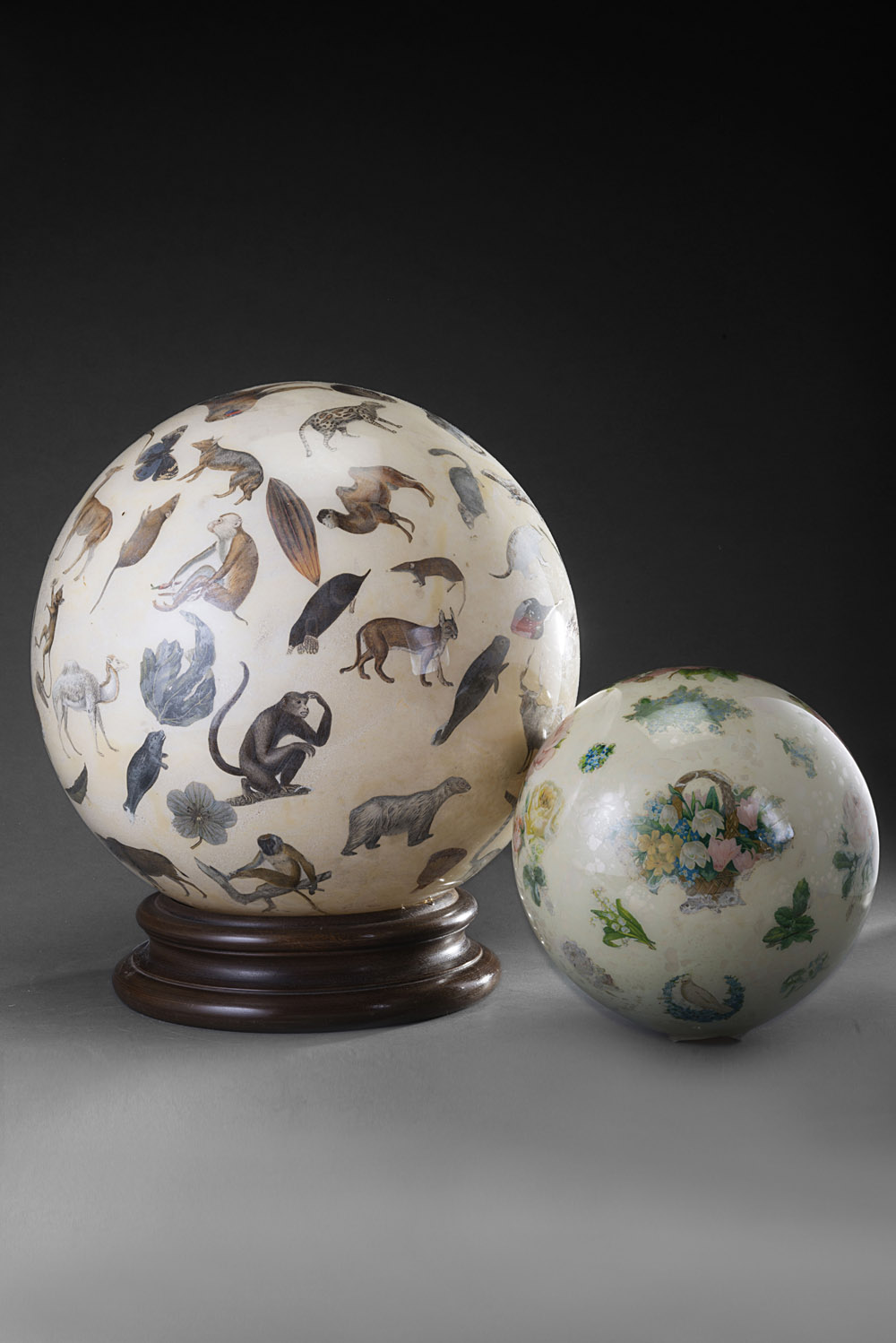 Due elementi decorativi di forma sferica in vetro soffiato decorati a decoupage con animali, rose e fiori; uno mancante di base (misure diverse) (difetti e mancanze) Two blown glass decorative elements one without base (different measures) (defects and losses)
