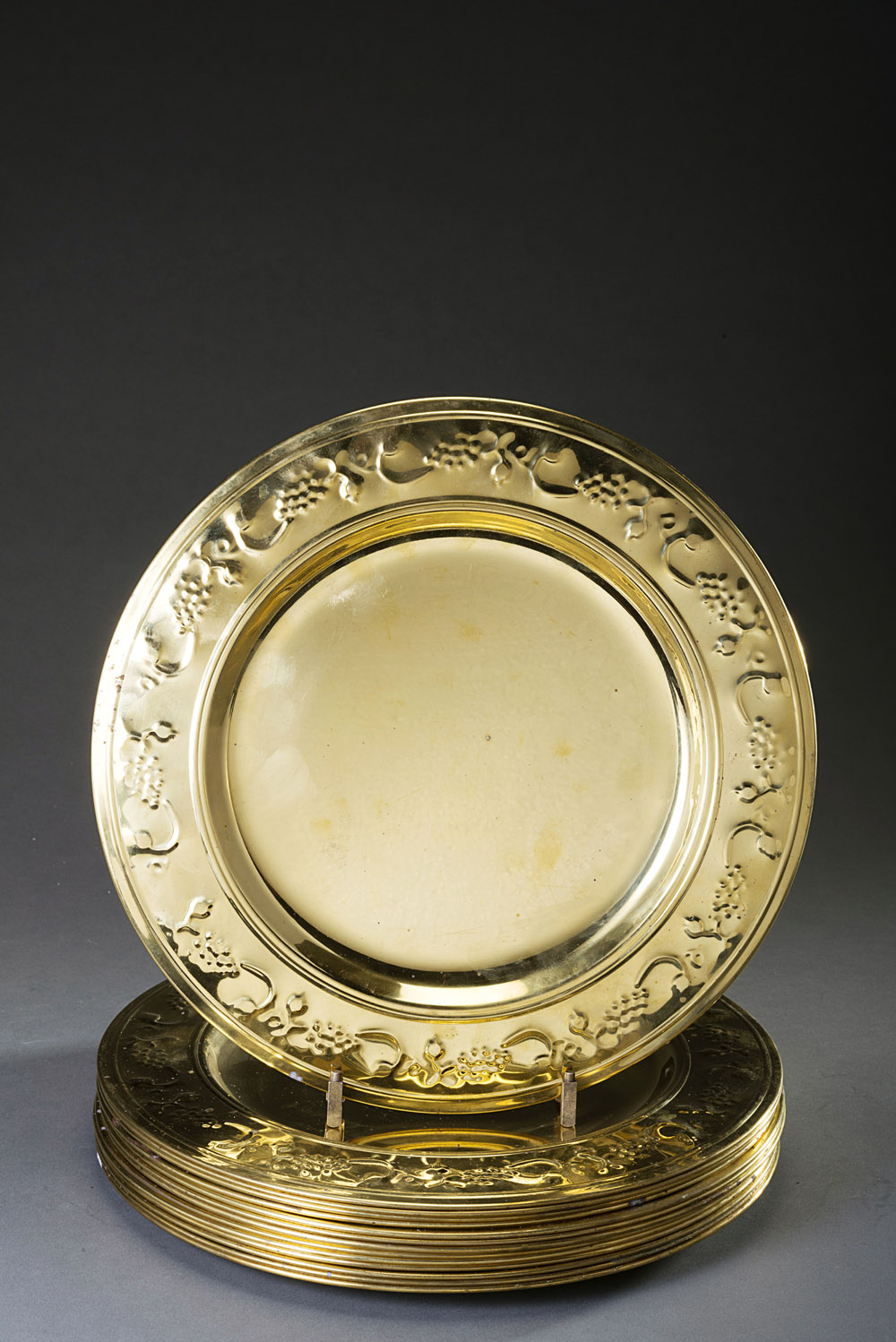 Gruppo di diciotto sottopiatti in ottone sbalzato sui bordi con uva e motivi vegetali (diam. cm 30) (difetti) Set of eighteen brass underplates (defects)