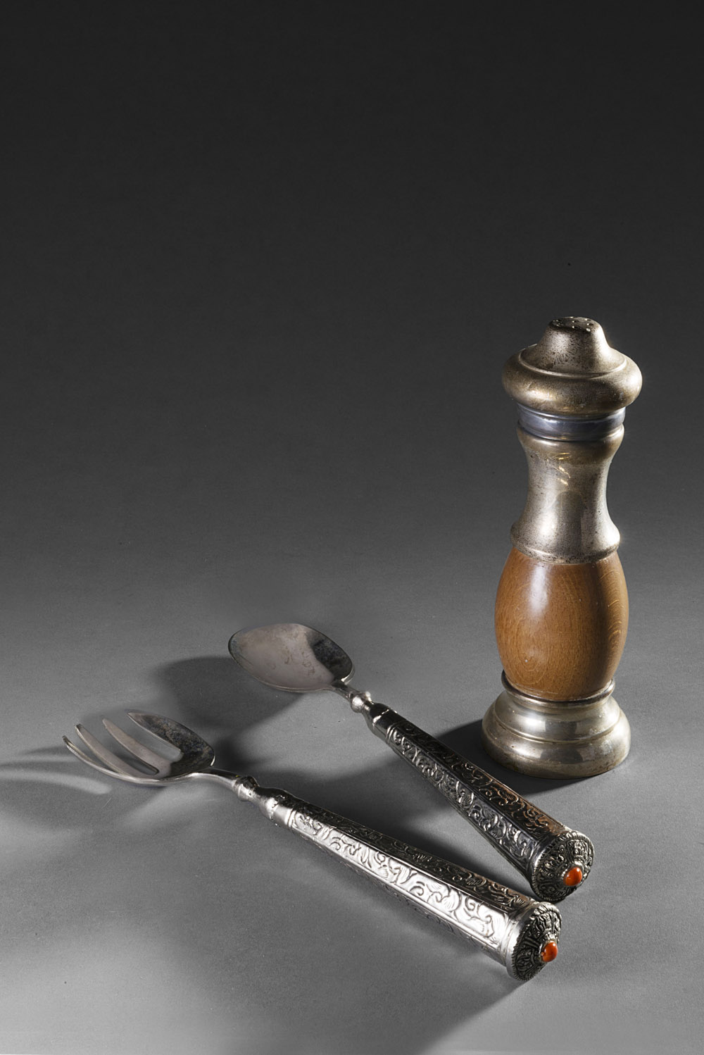 Lotto composto da due posate per insalata in metallo argentato di manifattura orientale e un sale e pepe in argento e legno dell' argentiere Cusi, Milano Lot comprising two silver-plated salad serving set of oriental manufacture and a silver and wood set of salt and pepper shakers by Cusi silversmith, Milano