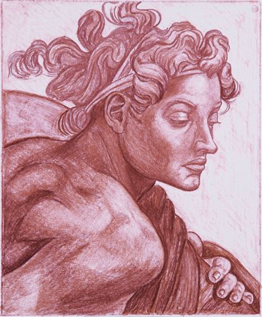 ROBERTO CANTARELLA Studio di un ignudo, volto della Cappella Sistina di Michelangelo Buonarroti, 1980 sanguigna su carta cm. 25,7x21, firma in basso a destra, etichetta dell'artista al retro.