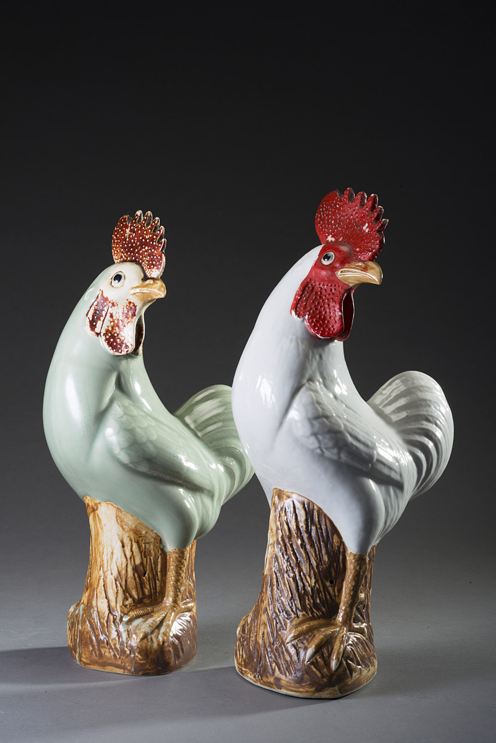 Manifattura cinese 'Galli' due statuette in porcellana policroma (h cm 37) Chinese manufacture "Cocks" two porcelain polychrome statuettes