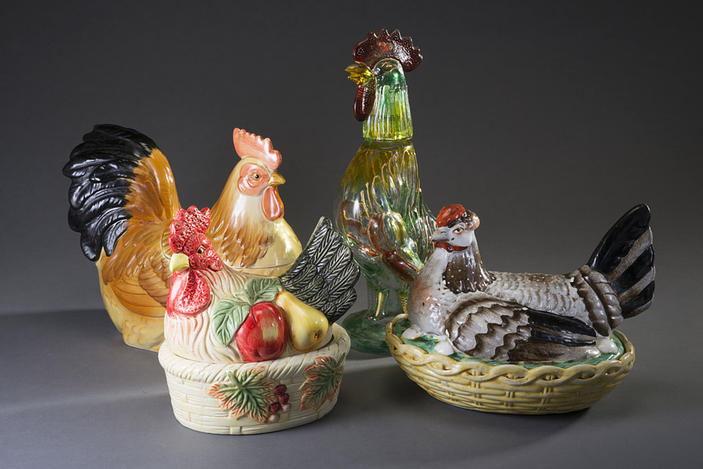 Manifatture diverse, lotto composto da tre zuppiere in ceramica e una bottiglia in vetro a forma di tacchino Various manufactures, lot comprising three ceramic soup tureens and a turkey glass bottle