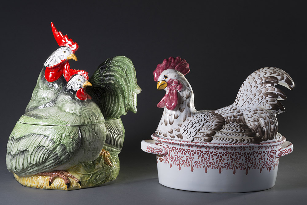Manifatture diverse, lotto composto da due zuppiere in ceramica policroma a forma di galli, una con mestolo Various manufactures, lot comprising two ceramic polychrome cock soup tureens, one with ladle