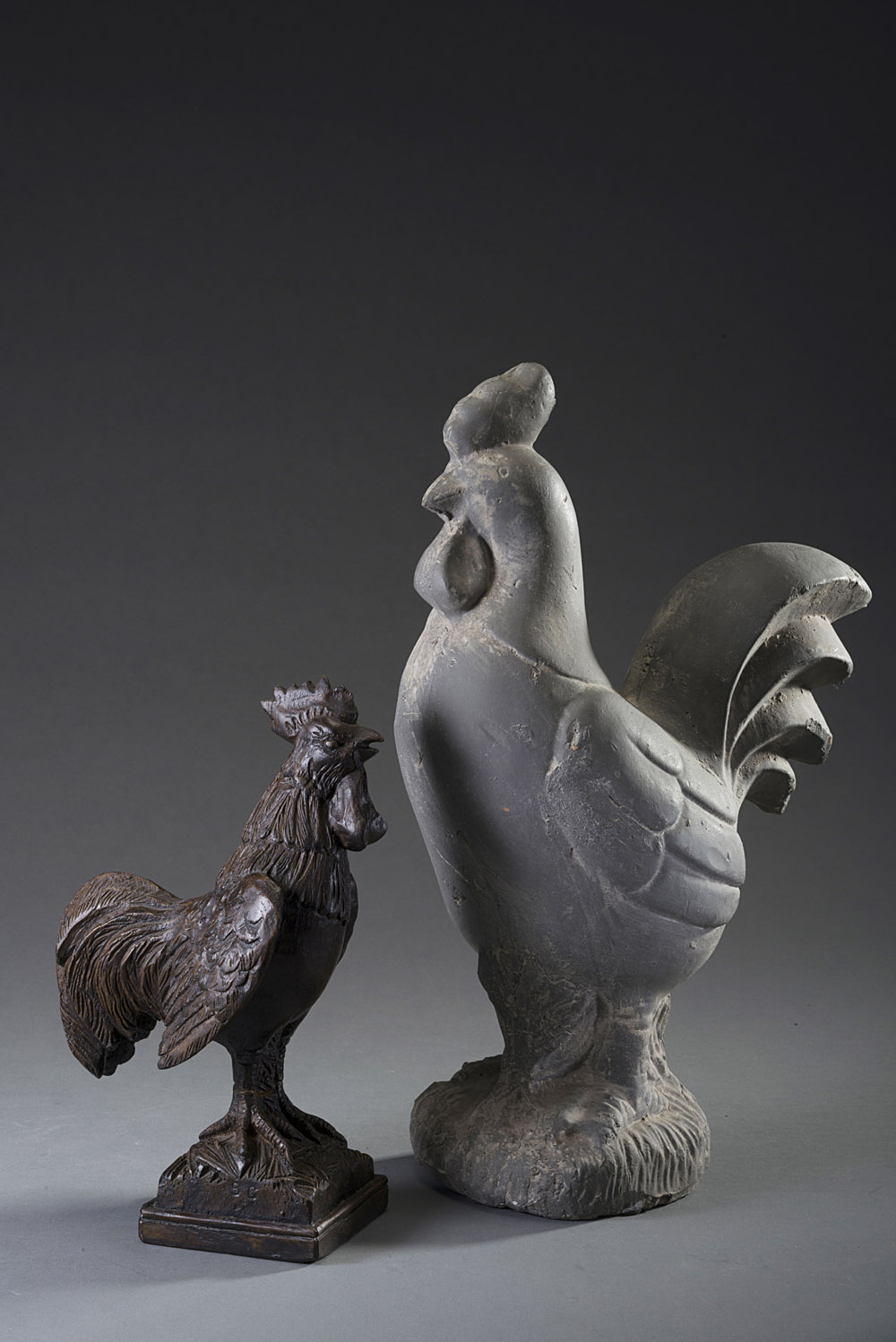 Lotto composto da una scultura in legno ed una in cotto patinata a finta pietra raffiguranti galli (difetti) Lot comprising a wooden and a clay sculpture representing cocks (defects)