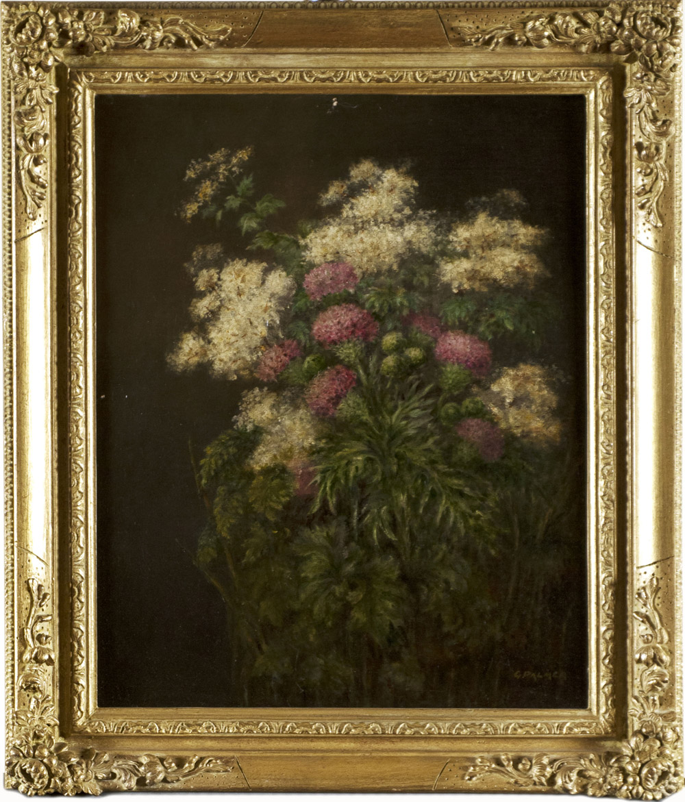 G. Palmer 'Composizione con fiori' olio su tela (cm 44x36) firmato in basso a destra. In cornice di legno intagliato e dorato G. Palmer "Flowers", oil on canvas, signed at bottom right. Carved giltwood frame