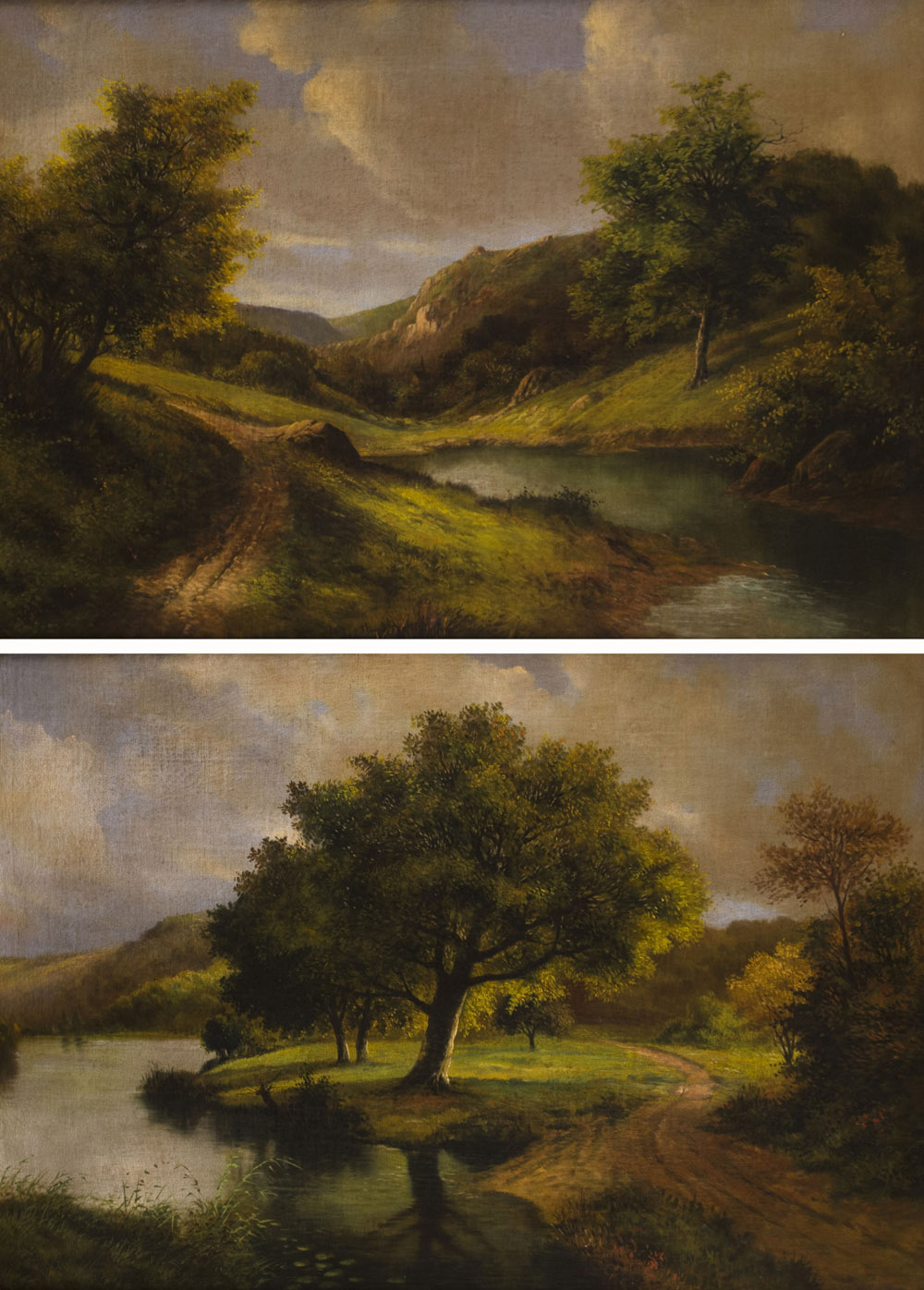 Scuola del sec. XIX 'Paesaggi fluviali' coppia di oli su tela (cm 50x70) in...