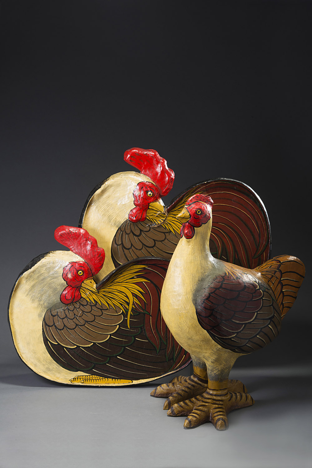 Lotto composto da tre galli in cartapesta policroma Lot comprising three papier-maché polychrome cocks