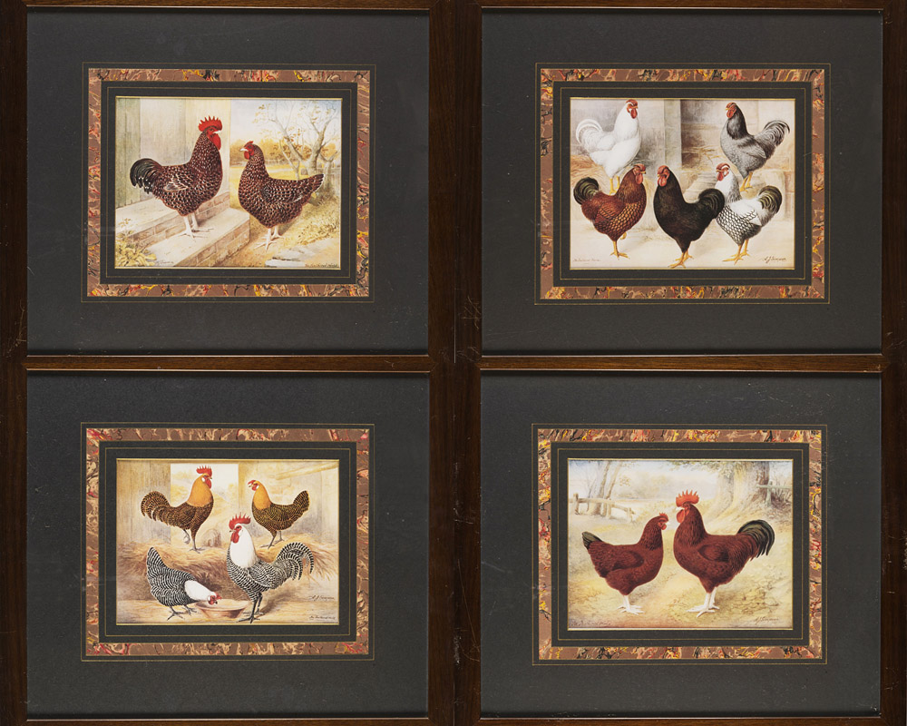 Gruppo di quattro stampe a colori raffiguranti galli (cm 18x15). In cornici Group of four coloured cock prints. Framed