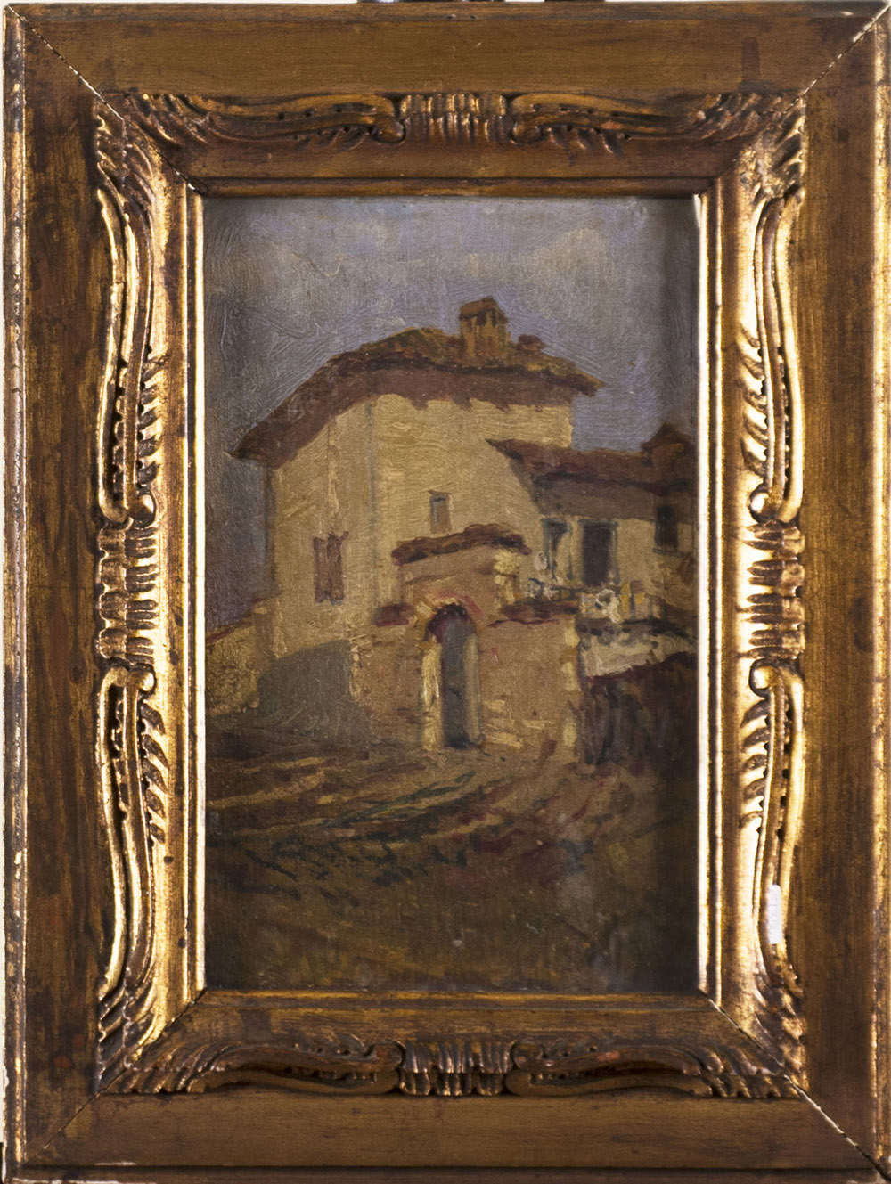 Scuola del sec. XIX 'Scorcio di cascina' olio su tavola (cm 22x14). In cornice di legno intagliato e dorato School of the 19th century "View of a Farmhouse" oil on panel. Carved giltwood frame