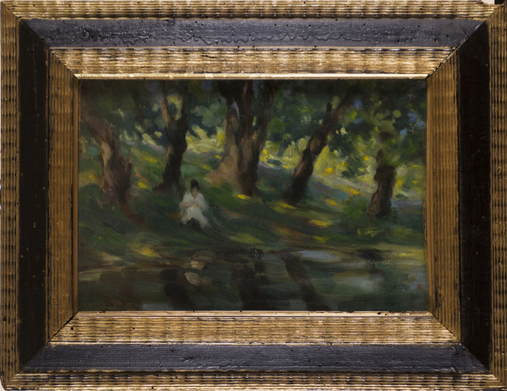 'Figure in un parco' olio su cartone (cm 24x35) firmato e datato 1920 in basso a sinistra e iscritto al retro. In cornice di legno laccato e dorato "Figures in a Park" oil on cardboard, signed and dated 1920 at bottom left and inscribed to reverse. Lacquered giltwood frame
