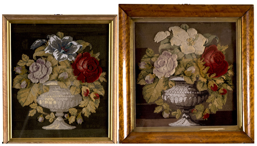 Lotto composto da due ricami a piccolo punto e perlinature raffiguranti vasi e fiori (misure diverse). Sec. XIX . In cornici Lot comprising two flower-vase petit-point needleworks (different measures), 19th century. Framed