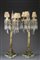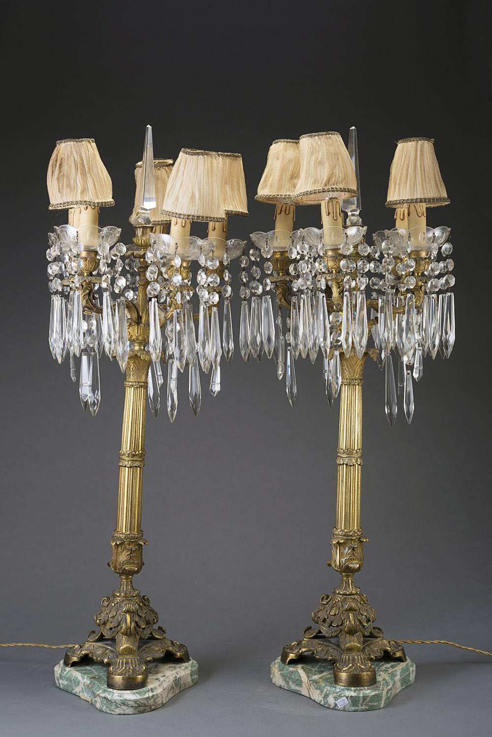 Coppia di candelieri in bronzo a cinque fiamme con braccia sagomate poggianti su fusto a colonna scanalata terminante con piedini cesellati a volute fogliate. Bobeche, pendagli e pinnacolo centrale in vetro e cristallo molato (h cm 76). Basi in marmo. Inizio sec. XX (difetti) Pair of five-light bronze candelabra. Bevelled glass shades and fittings, marble bases, early 20th century (defects)