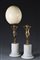 Coppia di obelischi in bronzo dorato raffiguranti putti che sorreggono un uovo di struzzo, poggianti su base in marmo bianco tornito (uno mancante di uovo) (h totale cm 38) Pair of bronze obelisks representing putti holding an ostrich egg. White marble bases (one egg missing)