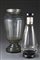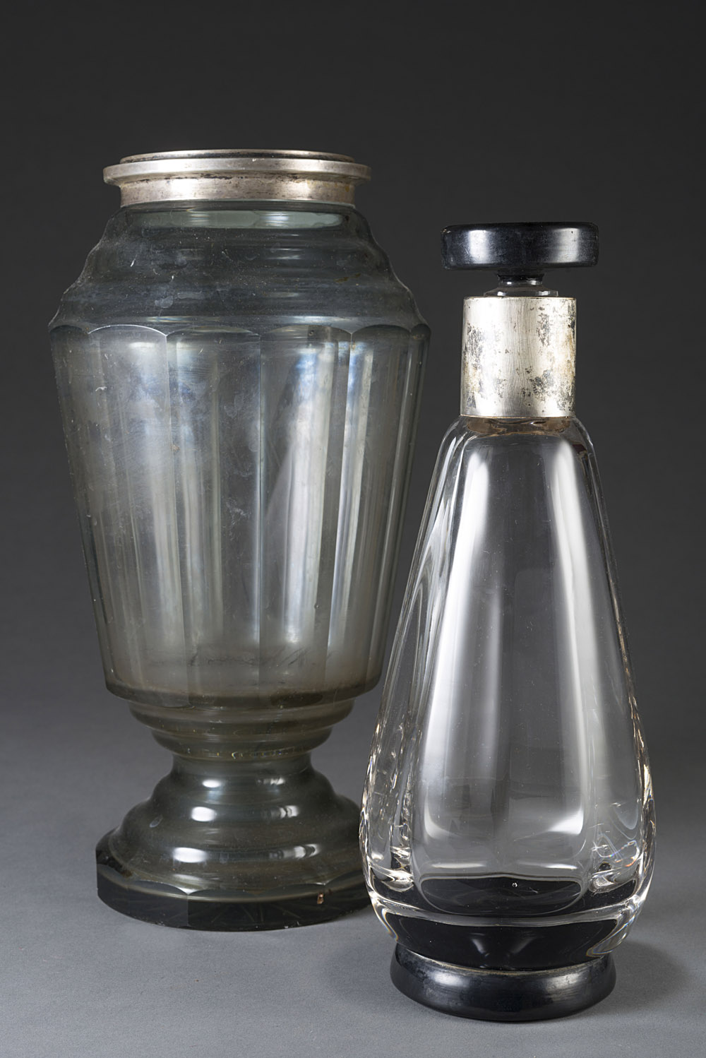 Lotto composto da una bottiglia con tappo ed un vaso in vetro con ghiere in argento (difetti) Lot comprising a bottle with top and a glass vase with silver ferrule (defects)
