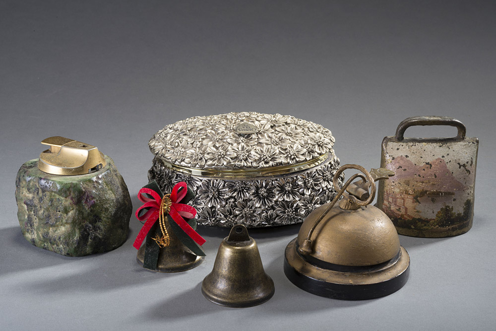 Lotto composto da un accendino da tavolo, quattro campanelle di epoche...