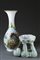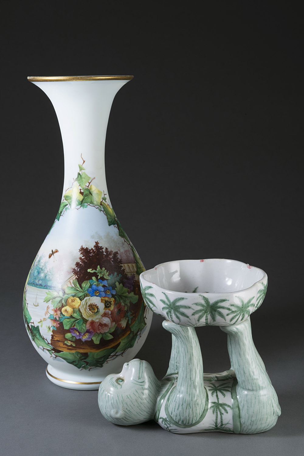 Lotto composto da un vaso in opaline di manifattura francese del sec, XIX decorato a paesaggio policromo ed un'alzata in porcellana di manifattura cinese raffigurante una scimmia che sorregge un piatto Lot comprising a French opaline vase of the 19th century and a Chinese porcelain centrepiece