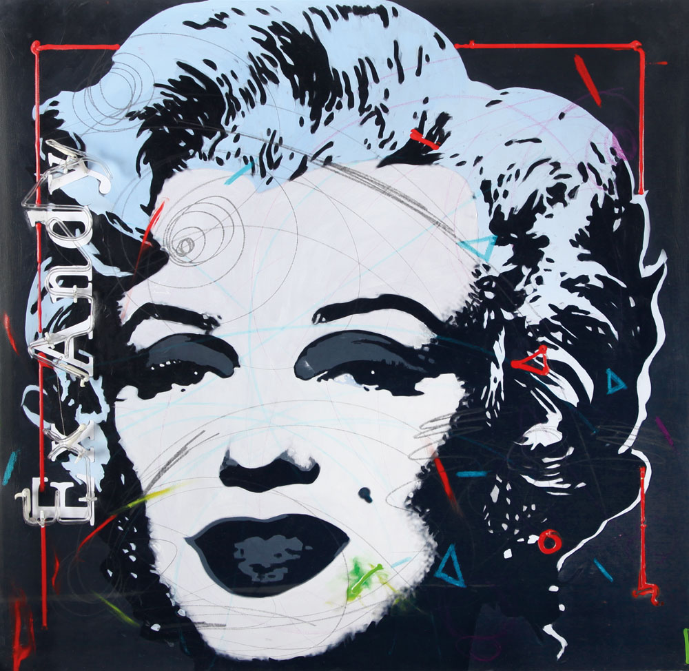 ENRICO MANERA Asmara (Etiopia) 04/04/1947 Ex Andy, 2009 smalti e neon su tela emulsionata cm. 100x100, firma, titolo e anno al retro, dichiarazione d'autenticità dell'artista e archivio a cura della Meeting Art (VC) su foto, entro teca in plexiglass