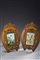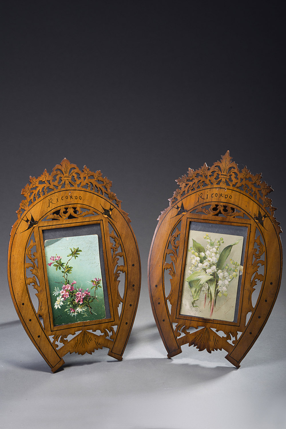 Arte sorrentina inizio sec. XX Coppia di cornici portafoto a forma di ferri di cavallo in legno pirografato e traforato a volute e volatili contenenti cartoline postali raffiguranti fiori (difetti) Art of Sorrento, early 20th century. Pair of horseshoe frames containing postcards
