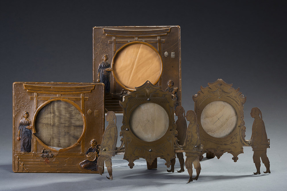 Lotto composto da due coppie di cornici : una in ottone con figure orientali che sorreggono pagoda, l'altra con figure giapponesi in un interno. Inizio sec. XX (difetti e mancanze) Lot comprising two pairs of frames: one with oriental figures the other with Japanese figures. Early 20th century (defects and losses)