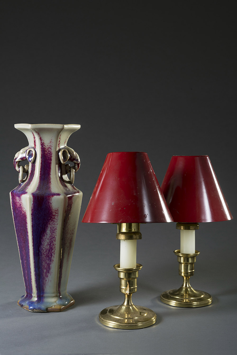 Lotto composto da una coppia di candelieri in ottone con coprifiamma ed un vasetto in ceramica di manifattura cinese Lot comprising a pair of brass candlesticks with shades and a Chinese ceramic vase