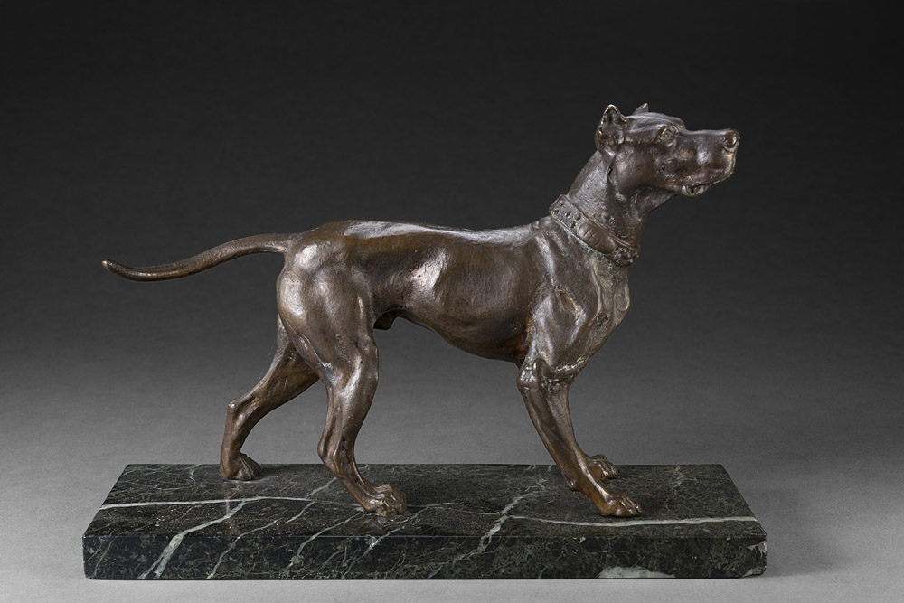 Scultura in bronzo raffigurante cane (h cm 18) poggiante su base in marmo rettangolare Bronze sculpture of a dog on marble base