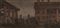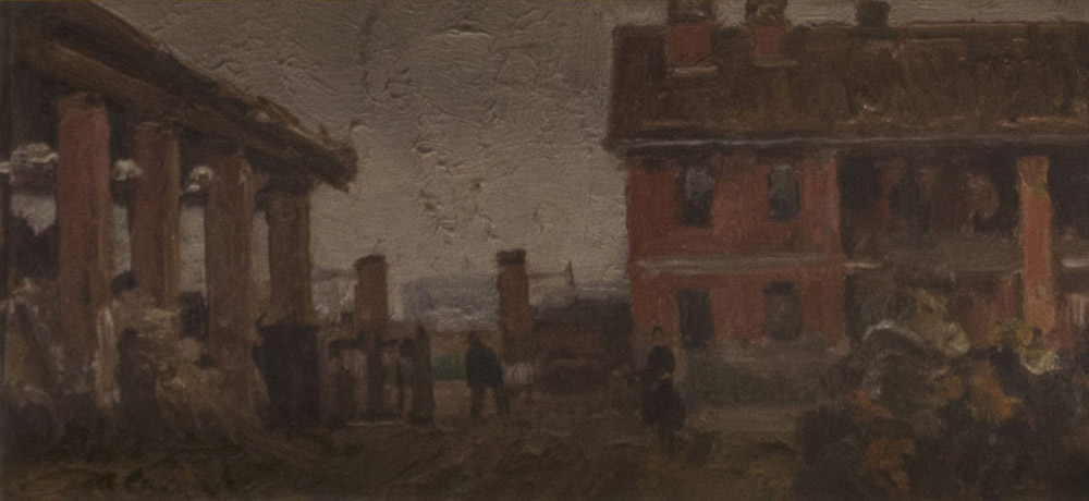 Firma indecifrata 'Cortile con figura' olio su tavola (cm 9x19) firmato in basso a sinistra e iscritto al retro. In cornice dorata Undeciphered signature "Yard with Figure" oil on panel, signed at bottom left and inscribed to reverse: Gilt frame
