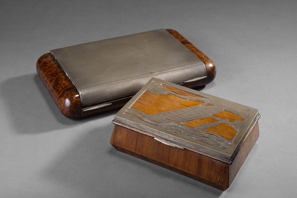 Lotto composto da due scatole: una in legno decorata con velieri in argento e l'altra in radica di forma bombata con coperchio laminato in argento Lot comprising two boxes with silver decorations