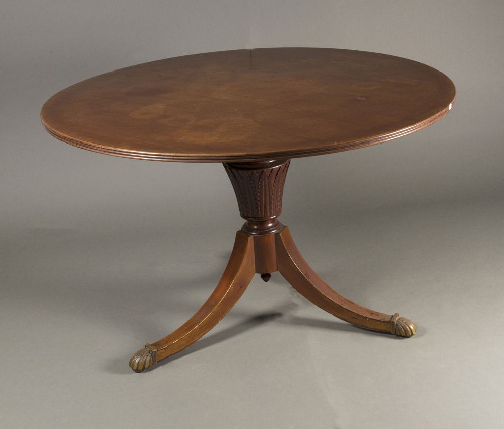 Tavolo tondo in mogano con gamba centrale a colonna intagliata a foglie d'acanto poggiante su piedi sagomati con scarpette in ottone (diam. cm 120x75) Round Mahogany table with bronze slippers