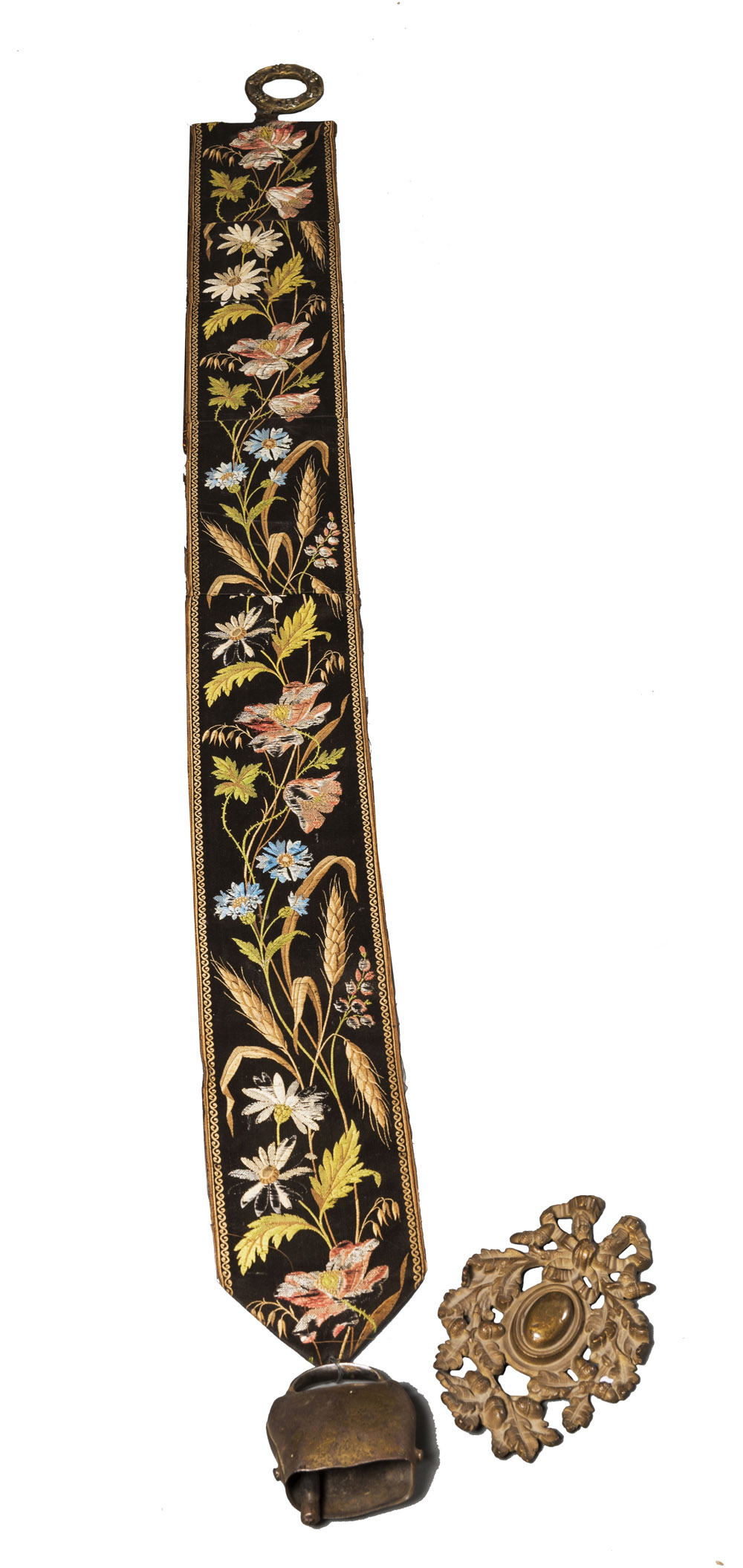 Lotto composto da un fregio in bronzo ed una striscia di tessuto in seta ricamata con campanello Lot comprising a bronze frieze and a strip of embroidered silk fabric with a bell