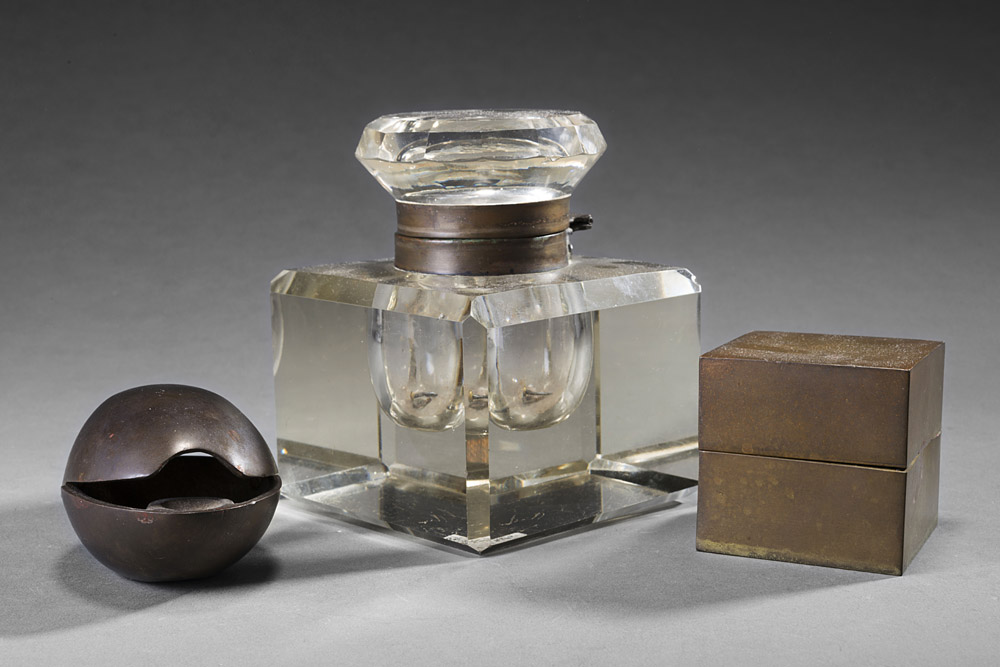 Lotto composto da un calamaio in vetro, una scultura moderna ed un posacenere da esterno in ottone (difetti e mancanze) Lot comprising a glass inkwell, a modern sculpture and an outdoor brass ashtray (defects and losses)
