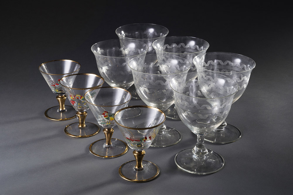 Lotto composto da quattro bicchieri da rosolio decorati con galli e sei coppe da champagne in cristallo inciso a greche geometriche Lot comprising four liqueur glasses and six champagne cups