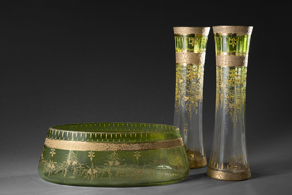 Manifattura di Moser 1920 circa Trittico da camino composto da due vasi a collo alto ed uno di forma ovoidale in vetro incolore con sfumature verdi . Decorati in policromia e dorature e motivi vegetali (h cm 40) Manufacture of Moser, circa 1920. Three-piece garniture de cheminée