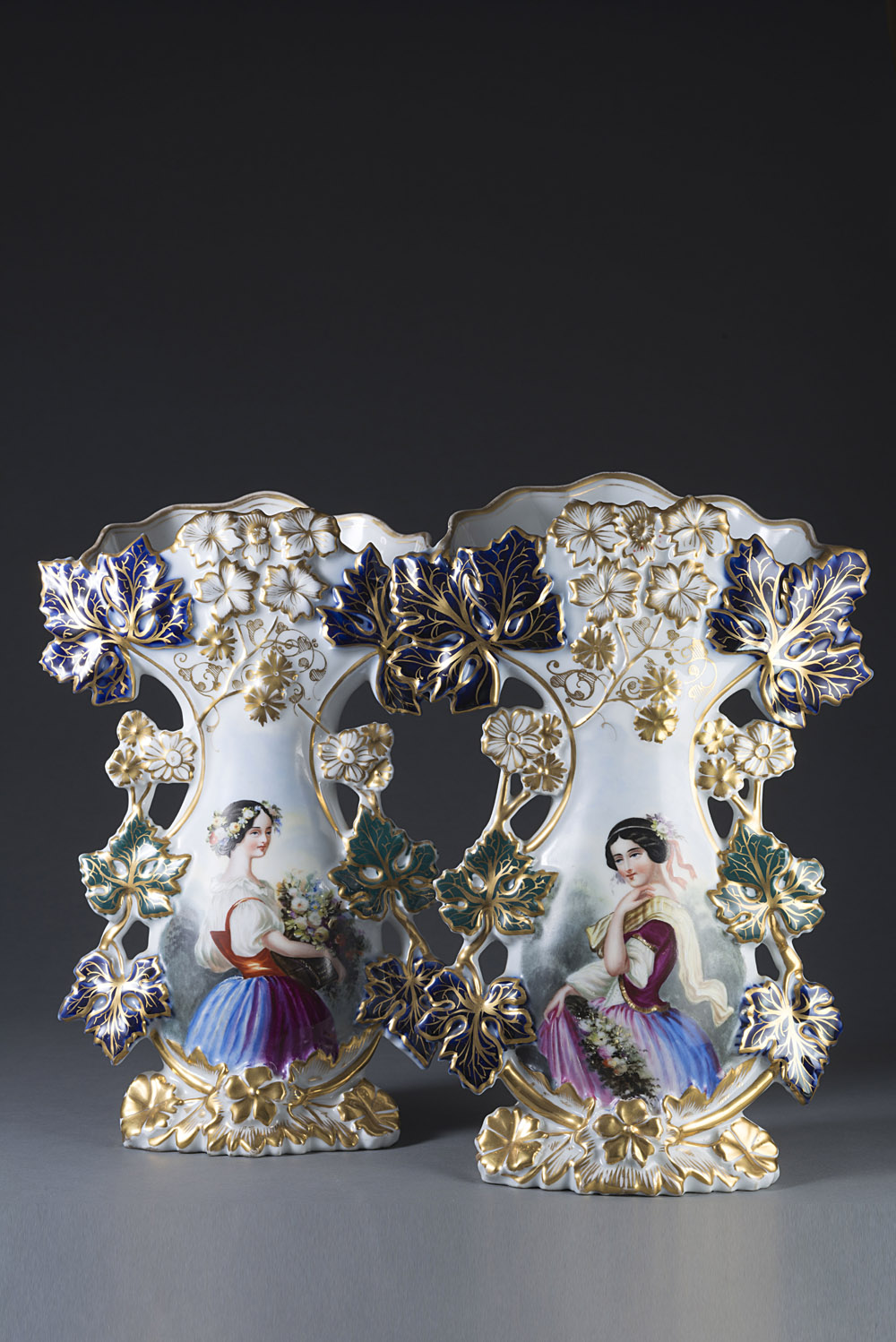 Manifattura francese sec. XIX Coppia di vasi in porcellana policroma, dorati con fiori, foglie e contadinelle con cesti fioriti (h cm 36) French manufacture of the 19th century. Pair of porcelain polychrome vases