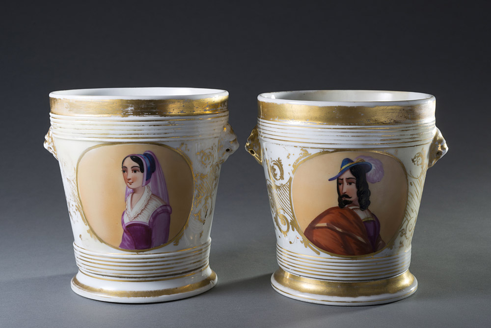 Manifattura francese fine sec. XIX, coppia di piccoli cachepot con piattini in porcellana dipinta a figura di gentiluomo e di gentildonna entro cornici dorate a volute. Anse a teste leonine (h cm 13,5) (difetti e restauri) French manufacture, late 19th century. Pair of small jardinières with porcelain plates (defects and restorations)