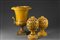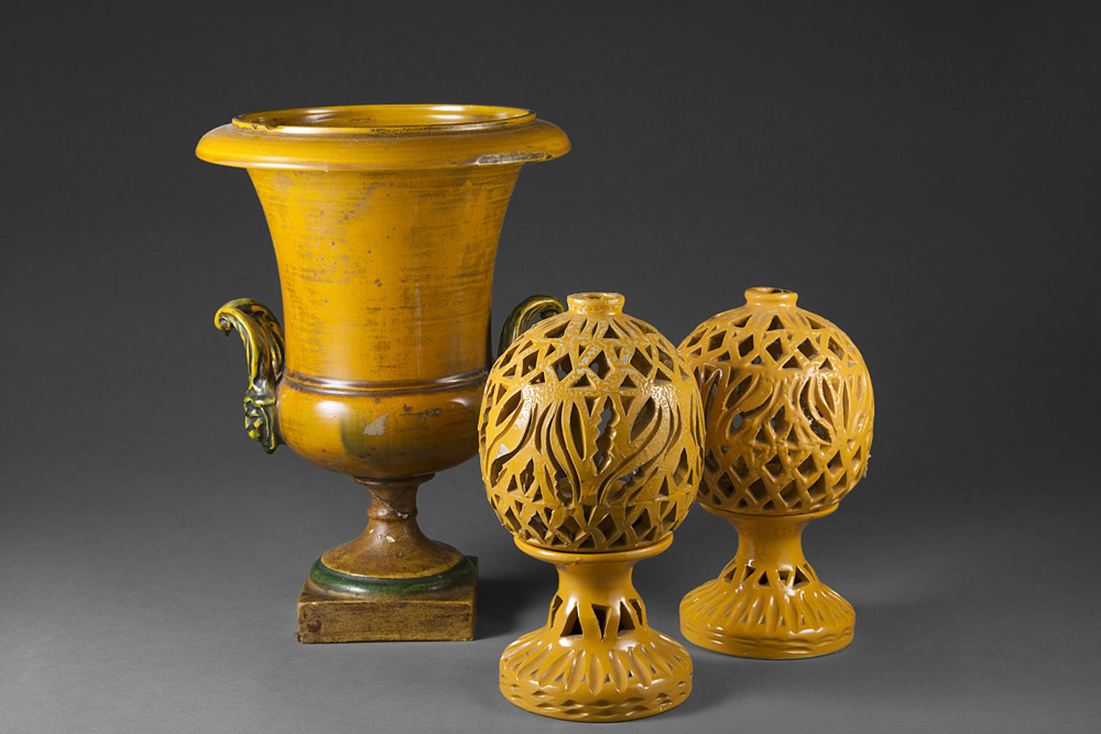 Lotto composto da un vaso 'mediceo' biansato e due bugie in terraglia ocra (difetti e restauri) Lot comprising a "mediceo" vase and two earthenware chamber candlesticks (defects and restorations)