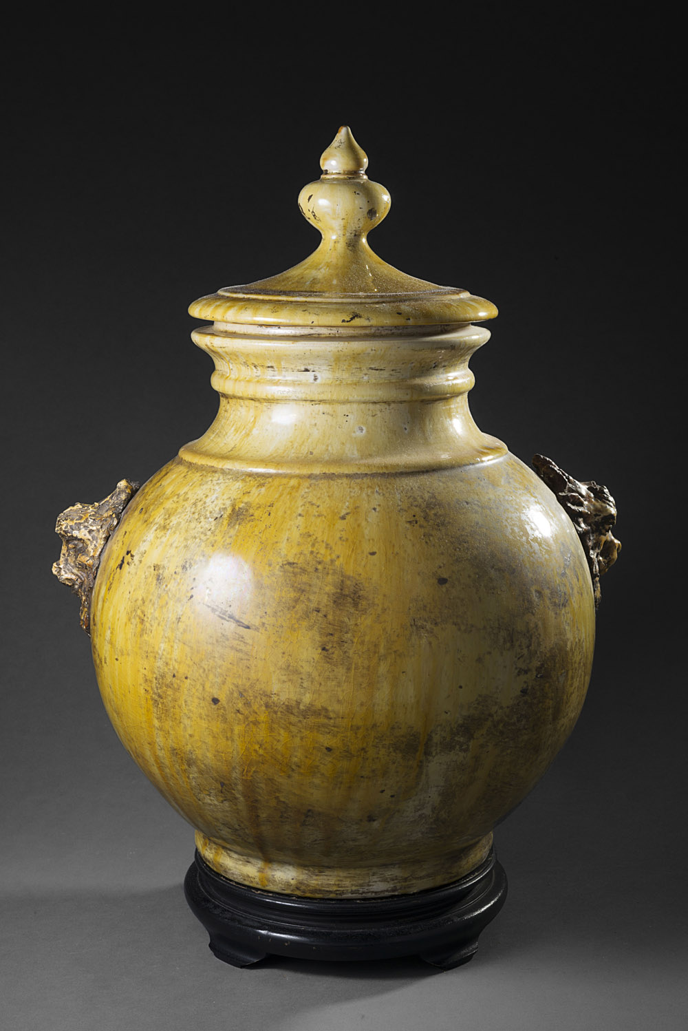 Vaso con coperchio in terracotta smaltata con colature ocra, anse in rilievo a teste di caproni (h cm 55) Poggiante su base in legno. Glazed terracotta vase with cover. Wooden base