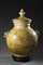 Vaso con coperchio in terracotta smaltata con colature ocra, anse in rilievo...