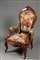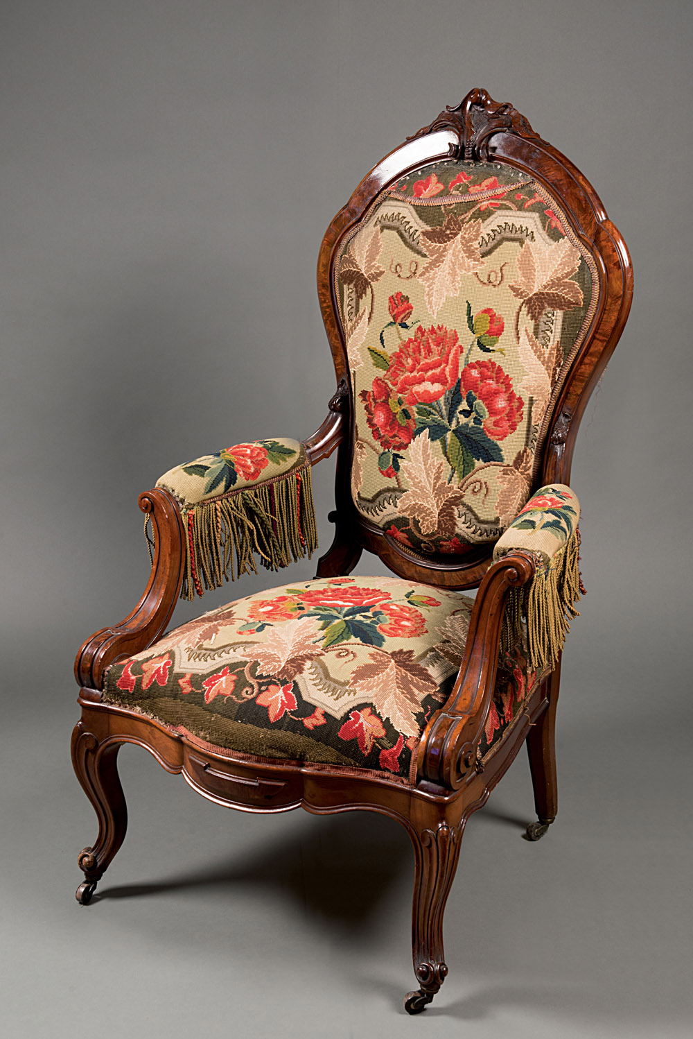 Poltrona in noce con cimasa intagliata a volute fogliate, braccioli mossi e scanalati terminanti a ricciolo. Gambe sagomate munite di rotelle. Sec. XIX. Rivestita in tessuto a piccolo punto a fiori (difetti) Walnut-wood armchairs, covered in petit-point needlework, 19 th century (defects)